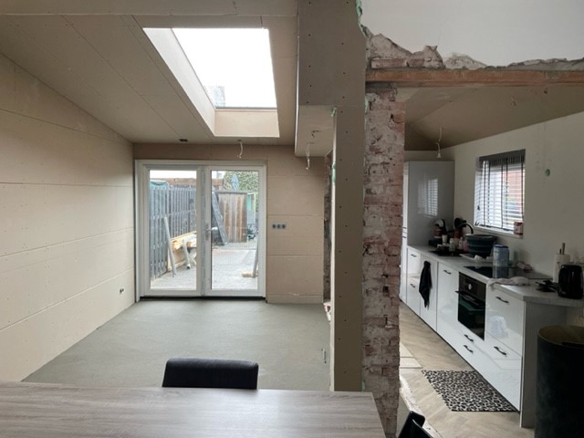 In een nieuwe aanbouw in Nieuw-Vennep. Er is alleen nog niet gestucd op de foto’s."