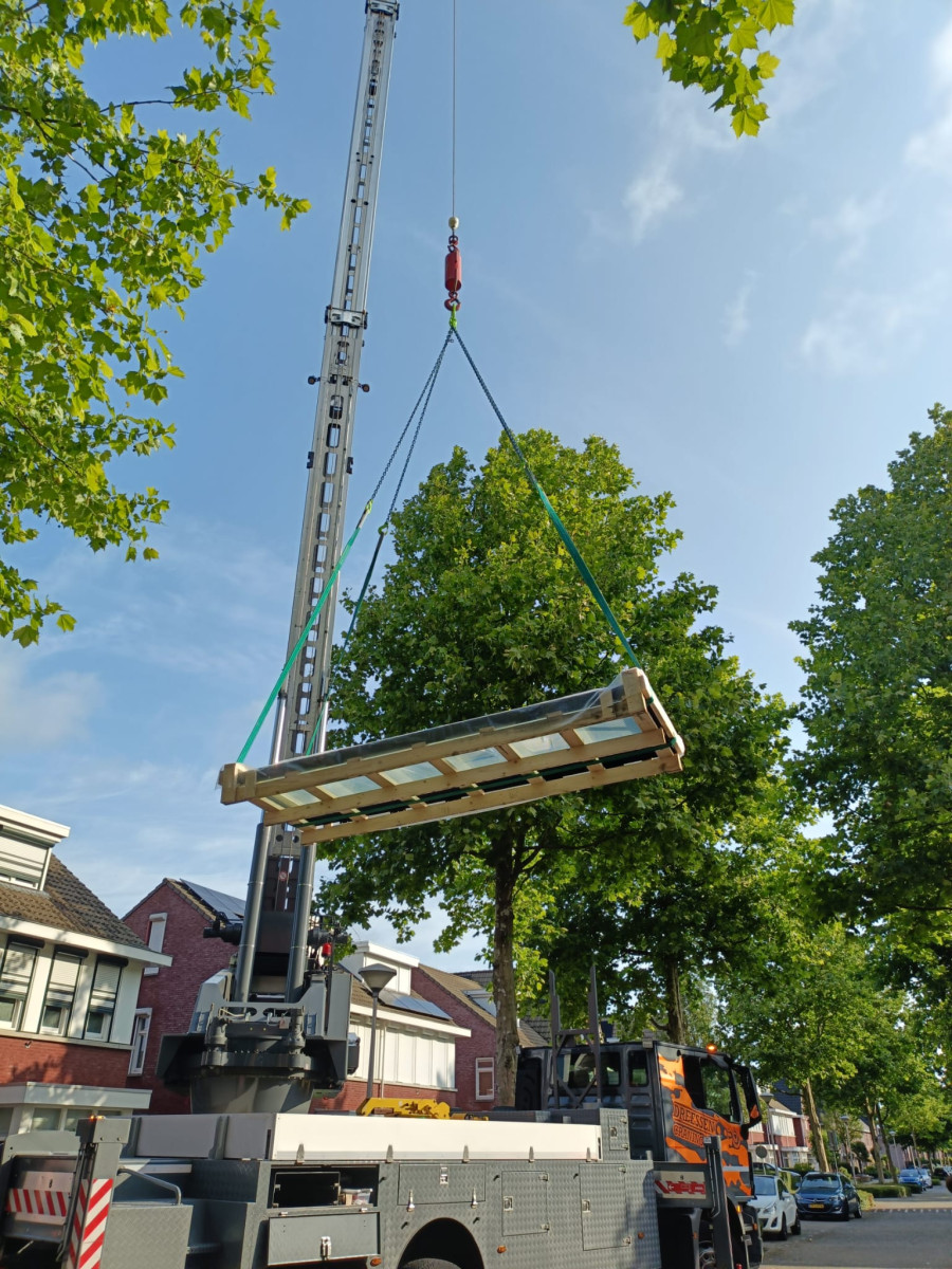 Meestal wordt het platdakraam ClearSky met de hand of een kleine tilhulp (kanalenlift) op hoogte gebracht. Maar uiteraard kan de aanwezige kraan die ook overige materialen tilt, dit daklicht ook meteen even meepakken. Omdat de ClearSky altijd met eigen onderliggende pallet wordt aangeleverd, is dit nul moeite. Zie de foto hoe dat hier op juiste wijze wordt gedaan: