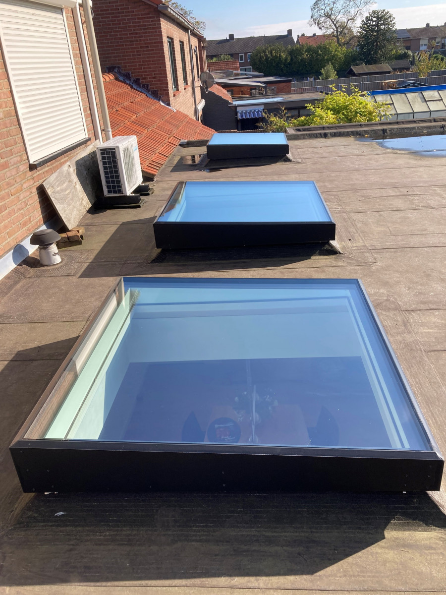 In Reuver (Limburg) heeft Yvonne 3 stuks kunststof lichtkoepels op het dak van de uitbouw, die al zeker 12 jaar oud zijn Ze ervaart de bekende problemen: koudeval, condens, geen doorzicht. En verliest bovendien veel warmte vanuit de woning door de lichtkoepels. Kortom, tijd voor vervanging. Na marktonderzoek bij diverse partijen kiest ze voor de renovatie-oplossing van daklichtshop: de TopSky voorzien van triple-glas. Omdat deze renovatie-dakramen af-fabriek al voorzien zijn van een eigen afschot lopen vuil en regenwater altijd van de ruit af. Om zeker te zijn dat de nieuwe ramen op de bestaande polyester opstanden zullen passen, doen we eerst een opname. Daaruit blijkt dat de bestaande opstand nog in goede staat is en de TopSky's zonder problemen daarop gezet kunnen worden ter vervanging van de oude schalen. Daarop plaatst ze de bestelling en laat door haar eigen dakdekker de plaatsing uitvoeren. Die heeft tot dan nog geen ervaring met de TopSky, maar zoals verwacht verloopt de montage/plaatsing moeiteloos.