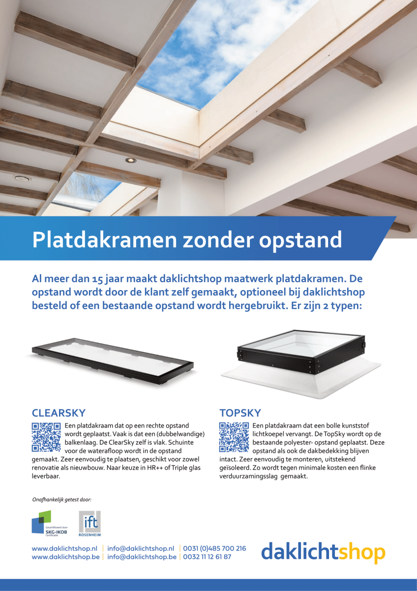 Een platdakraam dat op een rechte opstand geplaatst wordt. Bijv. een (dubbelwandige) balkenlaag. De ClearSky zelf (het "kozijn" inclusief glas en profiel) is horizontaal/vlak. Schuinte voor de waterafloop wordt in de opstand gemaakt.